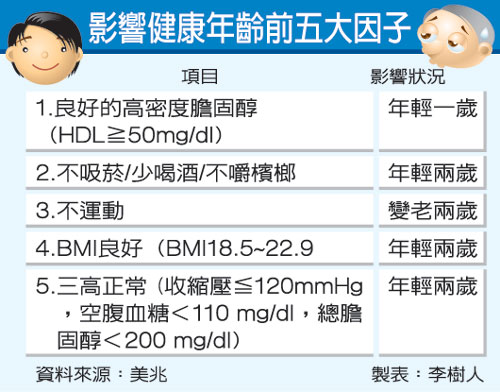 整體來說,美兆年度健康檢查報告顯示,島內民眾整體“健康年齡”比實際年齡年輕1.4歲,女性表現較男性佳,平均年輕2.8歲。如以地區來分,北部民眾“健康年齡”最年輕,平均比實際年齡少1.71歲,其中北部女性表現最佳,“健康年齡”比實際年齡平均年輕3.08歲。