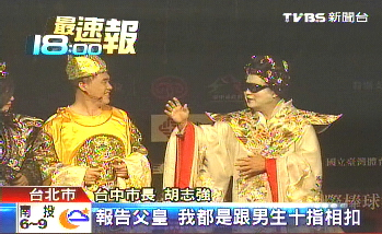 胡志強在臺上對扮演皇帝的郝龍斌說:“報告父皇,我都是跟男生十指相扣,跟你一樣,你也專門跟男人十指相扣!卑缪菝妹玫年愇能缫苍谂赃吰鸷,一起調侃郝龍斌日前和馬英九十指緊扣的牽手畫面。被搞笑攻擊的郝龍斌顯然招架不住,還一度接不上臺詞。(陳佳慧)