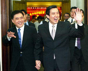馬英九和臺北市長郝龍斌近日參加臺軍退役將領春節(jié)聯(lián)誼餐會,把酒言歡后手牽手走出“勝利廳”。圖片來源:臺灣《聯(lián)合報》