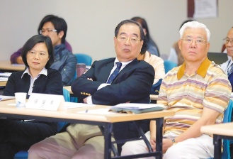 民進黨“十年政綱”首場座談會,大老尤清(右)到場踢館,質疑黨主席蔡英文(左)從未立過選舉戰功。圖為兩人隔著民進黨人士羅福全(中)聽取報告,互動尷尬。圖片來源:臺灣《聯合報》