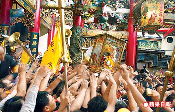 大甲鎮(zhèn)瀾宮媽祖進(jìn)廟時信眾搶摸媽祖本尊希望得到好運(yùn)。來源:臺灣《蘋果日報》