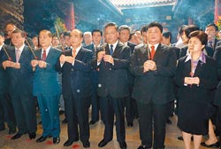 福建省長(zhǎng)黃小晶(右三)與臺(tái)“立法院長(zhǎng)”王金平(左三)、鎮(zhèn)瀾宮董事長(zhǎng)顏清標(biāo)(右二),向鎮(zhèn)瀾宮媽祖上香祝壽。圖片來(lái)源:臺(tái)灣《中國(guó)時(shí)報(bào)》
