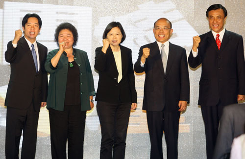 民進黨年底“五都”市長參選人蘇嘉全(右起)、蘇貞昌、蔡英文、陳菊與賴清德,5月25日一同出席造勢大會。(“中央社”圖)