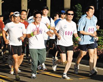 臺灣光仁社會福利基金會主辦的“光仁陪你慢慢跑”活動,今早在孫中山紀(jì)念堂熱鬧開跑。馬英九應(yīng)邀到場,換上運(yùn)動短褲,大秀“馬腿”。他替9公里的競賽組鳴槍,接著加入路跑人群,并帶領(lǐng)7名身心障礙朋友路跑,輪流跑完3公里的休閑組路程。