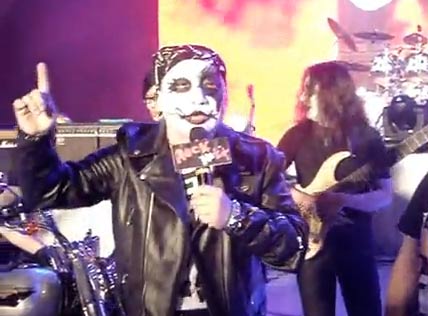 2010搖滾臺(tái)中樂團(tuán)節(jié)明天在臺(tái)中圓滿劇場(chǎng)登場(chǎng),臺(tái)中市長(zhǎng)胡志強(qiáng)(左二)特地扮成重金屬搖滾歌手現(xiàn)身記者會(huì)場(chǎng),為活動(dòng)暖身