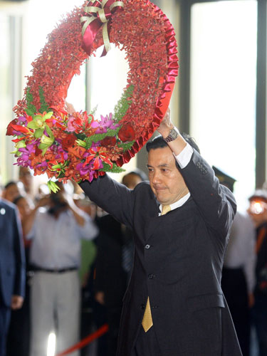 國民黨主席馬英九24日慶祝國民黨建黨116周年,前往臺北孫中山紀(jì)念館向?qū)O中山銅像獻花致敬。 圖片來源:“中央社”