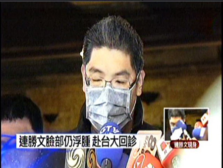 連勝文10日上午要前往臺(tái)大醫(yī)院進(jìn)行復(fù)診、換藥,在赴醫(yī)院前他特別短暫公開現(xiàn)身,讓媒體可以看到他臉上的傷勢(shì)及目前身體狀況。連勝文雙眼明顯浮腫,他戴著眼鏡及口罩,右眼邊上貼著透氣膠布。連勝文走起路來仍顯得蹣跚,媒體發(fā)現(xiàn)他的白頭發(fā)似乎變多了。