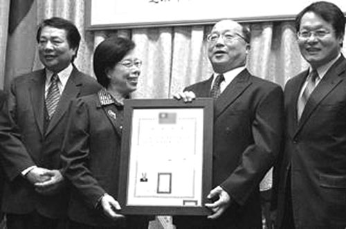 新當選大臺中市長的胡志強(右二)接過市長證書