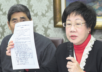 呂秀蓮(右)、“立委”蔡同榮(左)等上午召開“全民調產生好臺灣地區領導人?”記者會,拿出聯署提案及民進黨代表聯署名單呼吁進行黨員投票。 來源:臺灣《聯合晚報》