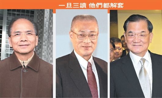 游錫堃(左一)、吳敦義(中)、連戰。一旦特別費條例三讀通過,他們都將解套。圖片來源:臺灣《聯合報》