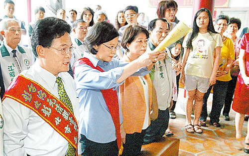 參拜吸票,蔡英文到彰化元清觀參拜,親拿祝禱文獻給玉皇大帝。圖片來源:臺灣媒體