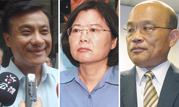 蔡英文(中)副手人選,“雙蘇”蘇貞昌(右)、蘇嘉全(左)浮上臺面。圖片來源:臺灣《聯合報》