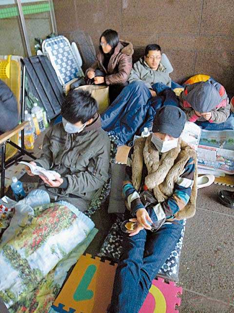 臺(tái)北市府一樓的申請(qǐng)路權(quán)排隊(duì)區(qū),國民黨與民進(jìn)黨分別派人漏夜排隊(duì),還準(zhǔn)備睡袋。圖片來自臺(tái)媒