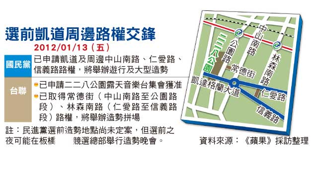報(bào)道稱,在確定拿下凱達(dá)格蘭大道路權(quán)后,馬英九、吳敦義競選總部昨宣布選前最后黃金周將在臺(tái)灣北、中、南、東部舉行大型造勢晚會(huì)與嘉年華式的大游行。