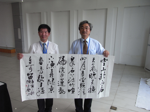 臺灣著名書法家陳志聲將自己的書法作品,贈送給南寧的邕江灣美術館館長鄔文康(中國臺灣網 蕪同 攝)