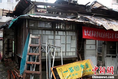 一代文壇名流梁實秋生前在臺居住地——位于臺北市云和街上的“雅舍”舊居,經歲月消磨,早已殘敗不堪。2003年被臺北市政府指定為“歷史建筑”后,又經多年踟躕,終于在不久前開始動工修復。圖為11月16日所見修復工程現場情景。據悉,該修復工程預計到明年6月24日完工。修復后的“雅舍”,計劃陳列展示梁實秋個人物品,并開放參觀。