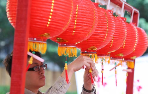 元宵節(jié)將至,臺(tái)北花博新生園區(qū)的花夢(mèng)廣場(chǎng)10日舉行猜燈謎活動(dòng),答對(duì)的人可獲得花博小禮物。一名工作人員將謎題綁在燈籠上。圖片來(lái)源:臺(tái)灣“中央社”