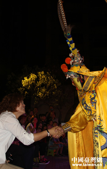 藝術(shù)家表演節(jié)目變臉并近距離與臺(tái)下觀眾互動(dòng)。(中國(guó)臺(tái)灣網(wǎng) 高斯斯 攝)