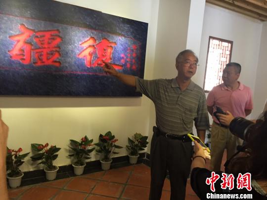 27日上午,臺灣抗日志士李友邦事跡圖片展暨座談會,在其祖居地廈門集美兌山社區(qū)舉行。圖為李友邦之子李力群在介紹李友邦著名的“復(fù)疆”石刻拓片 (陳悅 攝)