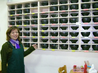 屏東面店碗墻上的每個(gè)碗都有編號(hào),客人可以選擇喜歡的號(hào)碼,放在貼有自己名字及編號(hào)的架子上,就算完成認(rèn)養(yǎng)。以后只要來用餐,老板就拿個(gè)人“專用瓷碗”裝面。