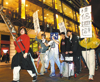 中新網12月24日電 “情侶退散、情侶回避、情侶肅靜!”在越來越濃的圣誕歡樂氣氛中,昨晚臺北卻出現“情人去死去死團”上街對情人表達不滿。
