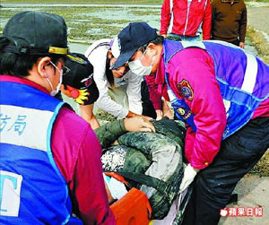 消防隊員將受傷的黃世駒抬上擔架送醫,經敷藥后黃已返家。來源:臺灣《蘋果日報》