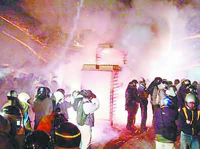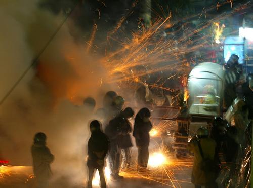 緊張的時刻終于來了。伴隨著電子音樂,神轎搖搖晃晃地向我們所在的炮城前走過來了。突然之間就“炸開了鍋”,只聽見震耳欲聾的炮仗聲,無數(shù)沖天炮呼嘯著在身邊鉆來鉆去,我嚇得連聲尖叫,不停地跳腳,想躲不知從何躲起,想逃卻無處可逃,被擠在人群之中,到處硝煙彌漫。