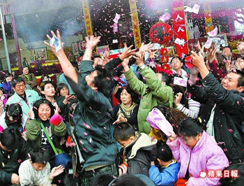 廟方人員張敏祥說,發(fā)財(cái)大炮裝有1000元、100元不等現(xiàn)金及發(fā)財(cái)金元寶、金雞蛋等吉祥物,“施放時(shí)現(xiàn)金從天而降,象征財(cái)神爺賜財(cái)”。昨發(fā)財(cái)大炮一施放,民眾不管搶到多少都很開心。高雄縣來的蘇先生說:“每年都專程來,不求發(fā)大財(cái),工作順利就好。”