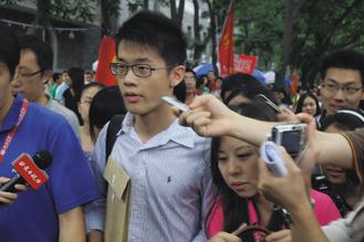 臺灣作家李敖的兒子李戡,昨天到北京大學報到,李戡走到那里,都有一大群媒體記者跟隨,也引來路邊的新生、家長關注。圖片來源:臺灣《聯合報》
