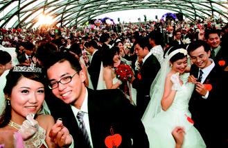 9月9日結婚大熱門,臺北市民聯合婚禮9日在花博園區舞蝶館舉行,163對新人秀出婚戒,幸福洋溢。 來源:臺灣《聯合報》
