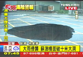 中國臺灣網10月22日消息 據臺灣TVBS電視臺報道,臺灣宜蘭蘇澳降雨量累積達939毫米,刷新去年8月8日“莫拉克”臺風在臺東大武創造的808.5毫米的最高紀錄。昨(21)日,蘇澳一座涌泉橋因為地基被暴雨淘空,橋面上破了一個10米寬的大洞。