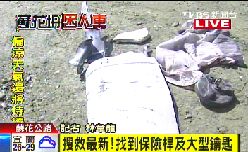蘇花公路發現疑似失蹤大陸游客所乘游覽車前方保險桿、插著鑰匙的油箱蓋、小孩洋裝和防火板。 來源:臺灣TVBS電視臺
