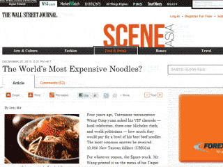 《華爾街日報》報道稱,這家面店在臺北東區,店里有40個座位館,供應著世界上最昂貴的牛肉面,一碗面的最高價竟達324美元(1萬新臺幣)。雖然該餐館也有比較便宜、只要200元新臺幣的普通牛肉面,但幾乎每一天,都會有客人點最昂貴的牛肉面。