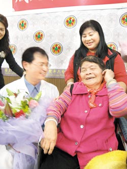 老太太兩度生命交關都是林寶彥救回,一年來兩人變得像朋友。昨日該院心導管室慶祝成立兩周年,老太太回院贈花給救命恩人,頻頻念著“我的命都是林醫師救回來的,謝謝啦,謝謝啦。”照顧她的三女兒陳麗如感動得掉淚。