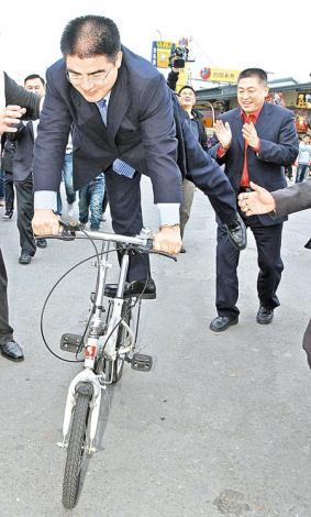 陳光標29日到南投紫南宮參拜時看到路旁有腳踏車,一時興起,表演單腳騎車“特技”。圖片來源:臺灣《中國時報》