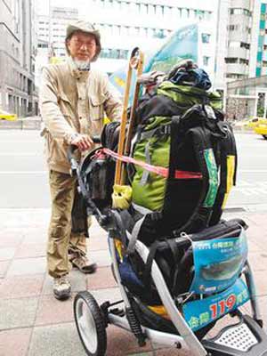 資料圖:“臺灣阿甘”林明德推著20公斤的行囊,一步一腳印巡回臺灣。