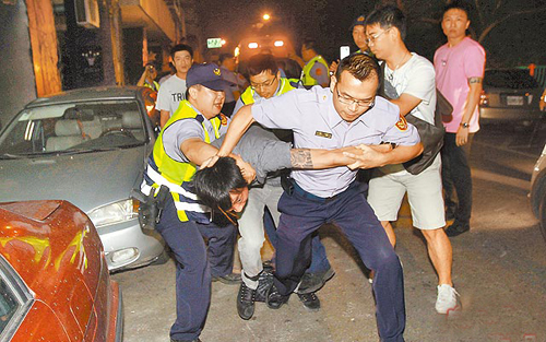 壓制酒客,酒客友人林某不聽警方制止,以三字經(jīng)辱罵警員,還揮拳毆打一名警員,最后被警壓制在地上銬。圖片來源:臺(tái)灣媒體
