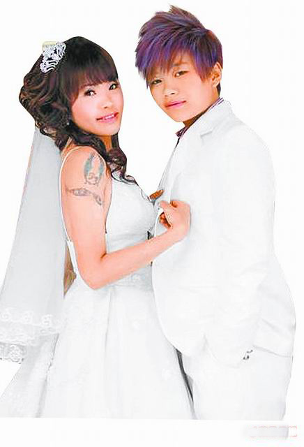 日前小笨與小狗來臺(tái)北度蜜月時(shí)接受《蘋果》專訪,在西門町里2人就像甜蜜的小情侶,打鬧、調(diào)情,憨直的新郎小笨?jī)H19歲,目前是飯店服務(wù)員,而爆乳的辣妹新娘小狗25歲,則是發(fā)型設(shè)計(jì)師,他們說自小學(xué)起自覺是女同志,且早就向家人出柜,2人在網(wǎng)絡(luò)聊天室認(rèn)識(shí),5年來因家庭反對(duì)壓力而分分合合,最后決定廝守一生。