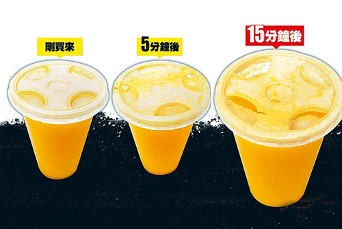 柳橙汁竟在20分鐘內溶解部分杯蓋,連檢驗人員也難以置信。圖片來源:臺灣媒體