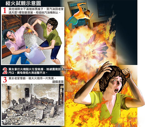 睡二樓的母親下樓與黃姓女子搶油桶,她仍不松手,將剩余汽油全倒在客廳,拿出打火機(jī)點(diǎn)火,母見狀往廚房跑并向著二樓喊:“趕快跑!”打火機(jī)火苗引爆充斥一樓的油氣,黃姓女子被氣爆震飛跌坐大門口,全身85%燒傷,其母身陷火海送醫(yī)不治,姐姐身受12%灼傷。