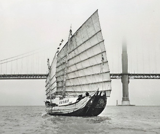 臺灣首艘橫渡太平洋的古帆船,當年歷盡艱辛航抵美國,通過舊金山大橋。(圖片來自臺灣媒體)