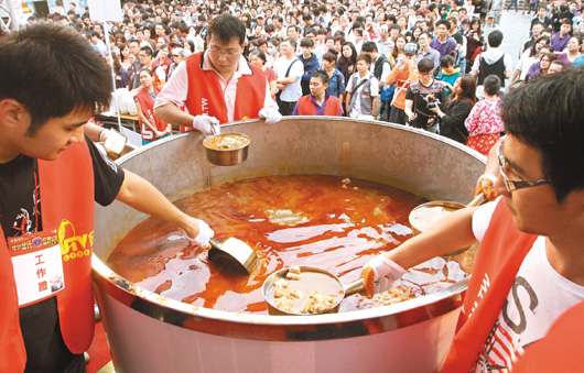 1319人花了約1小時(shí),同時(shí)分食高89公分,直徑148公分,重1026公斤的臭豆腐罐頭,成功完成世界最大臭豆腐罐頭及最多人同時(shí)分食的吉尼斯紀(jì)錄。平均每個(gè)人要吃掉超過1公斤的臭豆腐,讓參與民眾直呼“好過癮”。