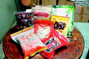桃園縣衛(wèi)生局配合南投檢警查封“翁財記”龍?zhí)豆S的瓜子、花生、蠶豆、青豌豆4大類5006包過期食品。(圖片來源于:臺灣《聯(lián)合報》)