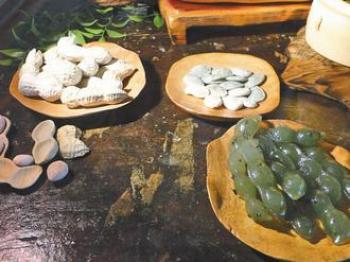 臺灣石雕家林仁德以玉石為原料雕鑿出毛豆、花生、瓜子等美食,維妙維肖。(圖片來源于:臺灣《聯合報》)