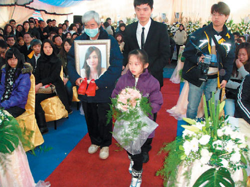 這場“告別式婚禮”,昨天中午在莊家舉行,莊聰明抱著女兒遺照、高跟鞋,和女婿陳佳何一起走紅地毯,走到女兒靈堂前,把“女兒(照片)”交給陳佳何,莊母不舍,把女兒的高跟鞋抱在懷里,哭倒在女婿身上。