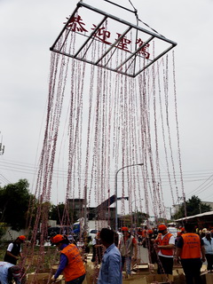 大甲媽祖鑾駕進(jìn)入嘉義縣境后,開始繞行新港各莊頭,沿途家家戶戶都擺設(shè)香案虔誠膜拜,所經(jīng)之處鑼鼓喧天,煙火鞭炮聲不斷。更有信眾請來大型吊車,動員大批人力,花費巨資,在現(xiàn)場架起高達(dá)60米的連珠炮塔恭迎媽祖圣駕,燃放鞭炮時場面極為壯觀,吸引眾多信眾圍觀歡呼。