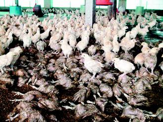 雞舍內布滿死雞尸體,殘存的雞就踩在死雞上瑟縮發抖;林正松說,這四萬多只雞再一個多月就能賣錢,現在全都沒了。