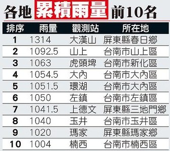 臺灣各地累積雨量前10名。(圖片來自臺媒)