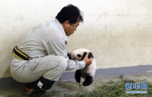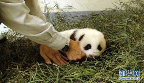 大熊貓保育員幫“圓仔”更換全新“竹葉床”(9月5日攝)。近日,贈臺大熊貓“圓圓”產下的寶寶“圓仔”已滿兩個月,保育員為“圓仔”更換了全新“竹葉床”,以保證它安穩舒適地睡覺。據介紹,“圓仔”以前睡的“嬰兒床”由媽媽“圓圓”用自己的食物——竹葉鋪成,“圓圓”和“圓仔”“分床睡”。