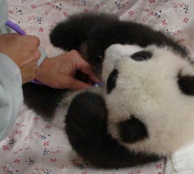 7月6日出生的“圓仔”,現(xiàn)體重快要突破6公斤,比出生時增長約32倍之多,昨天是“圓仔”體檢的日子,獸醫(yī)師首先替“圓仔”檢查耳朵,接著進行頸、腋窩和鼠蹊部的淋巴觸診,并觸摸檢查四肢掌部的發(fā)展,都沒有異常,隨后的心跳、呼吸聽診也均為正常。